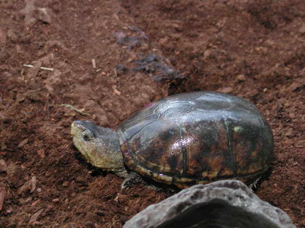 scheu. Unterwasserhöhle und Wurzel als Kletterhilfe zur Wasseroberfläche